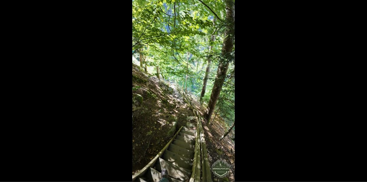 Even door de toegangspoortjes en onze tocht kan beginnen. Door het bos lopen we langzaam de kloof in. Het is heerlijk rustig. We lopen nagenoeg alleen door de kloof. Ideaal omdat we nu met de honden op ons gemak de trappen op kunnen lopen (of tillen), foto’s kunnen maken en vooral gewoon kunnen genieten van de prachtige natuur. Want prachtig is het! Over de houten vlonders die aan de rotswand zijn gemaakt, de vele trappen en verschillende bruggen loop je door de kloof langs verschillende watervallen. In totaal zijn er 14 niveaus waarover het water naar beneden raast. Onderweg staan nog een aantal informatieborden (allemaal in het Frans) die bezoekers wijzen op de gevaren en veiligheidsvoorschriften.